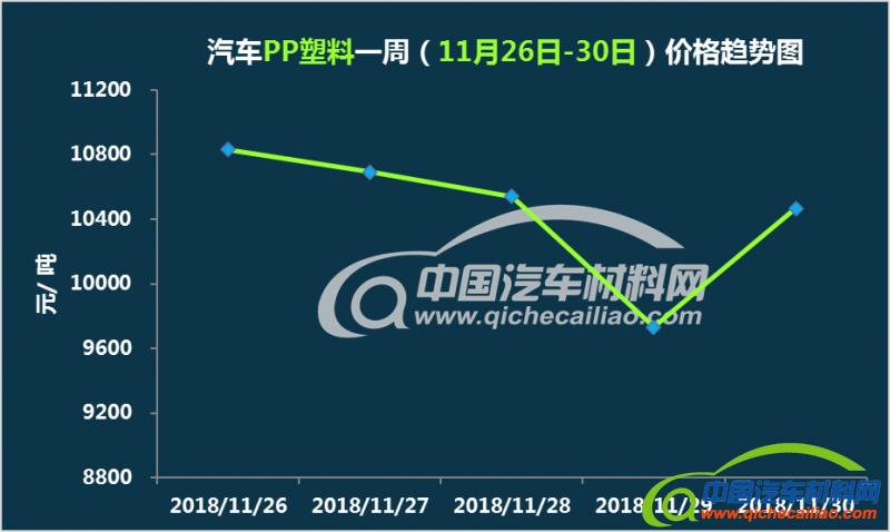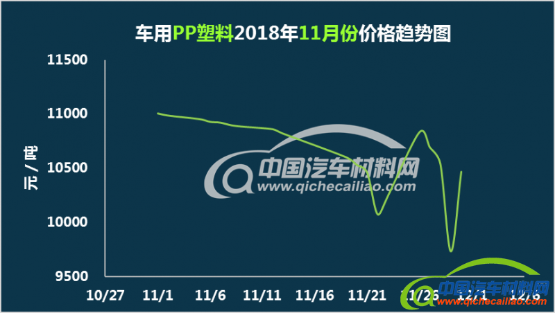 车用PP塑料本周价格变化如下:11月26日-29日价格下跌,跌幅为1100.02元/吨;11月29日-30日价格又大幅回升,一日内涨幅为735.64元/吨。车用PP塑料本周均价为10452.69元/吨,较上周上涨0.67%,较11月份均价下跌1.89%。