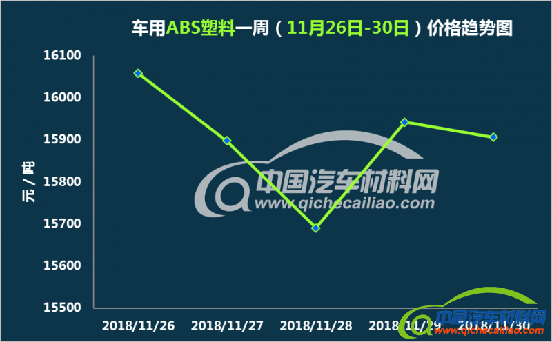 ABS塑料本周价格变化如下:11月26-28日价格下跌,跌幅为367.08元/吨;11月28-29日价格回升;11月29-30日价格再次小幅下跌。车用ABS塑料本周均价为15898.81元/吨,较上周下跌2.29%,较11月份均价下跌4.02%。