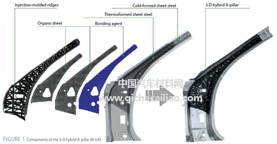 对于需要承受高应力的碰撞结构件,纯金属结构已逐渐被淘汰。特别是对于新能源汽车,需要创新动力系统设计,以抵消电池带来的整备质量增加,满足碰撞安全要求,同时最大化电池安装空间。为此,保时捷、德国Mitras、萨克森(德国)的轻量化设计中心(Leichtbau-Zentrum Sachsen,LZS)和德累斯顿技术大学的轻量化工程和聚合物技术研究所(ILK)联合开展了“三维材料混合应用技术”项目,该项目由Sächsische Aufbaubank(SAB)赞助。旨在将先进的材料混合方案应用于车身结构件的开发中,例如图1所示的混合材料车身A柱。