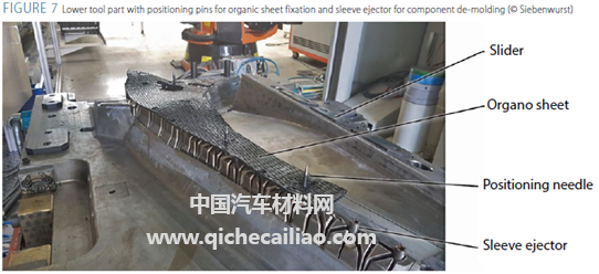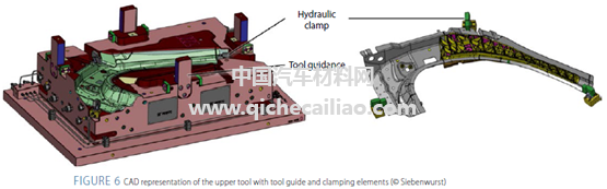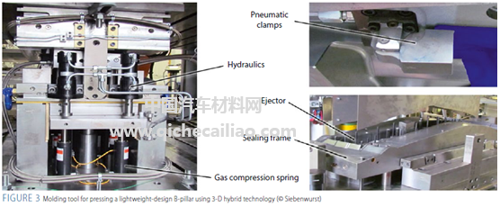 为实现钢板、玻纤增强有机板、长纤维模压复合材料混合结构的加工,2013年Siebenwurst开发了一种用于冲击挤压加工的特殊模具,并在ILK工艺开发中心的项目中投入使用,如图3。上部有多个气动夹具,确保压制过程中钢板的可靠定位。下部设有多个元件,液压系统可确保将有机板定型和压制到钢制外壳中;密封框架可防止热塑性化合物在挤压过程中出现泄漏;待模具内塑料凝固后,可以使用顶针部件实现脱模。