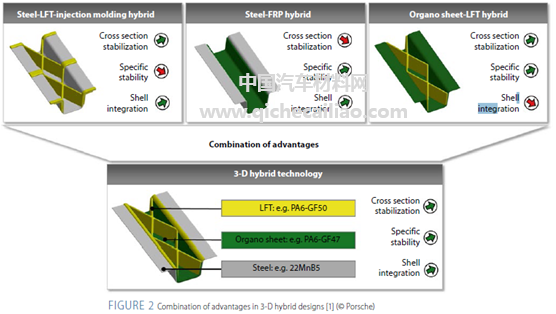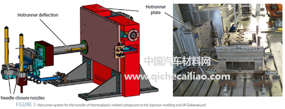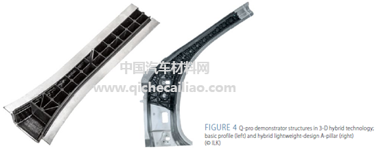 项目组以混合设计A柱为例进行了工艺优化,如图4。Siebenwurst开发了大型三维混合结构模具,将原始挤压成型工艺改为注塑成型。通过与保时捷的密切合作,以及合作伙伴(ILK,VW和ESI)的工厂进行持续的流程模拟,实现了设计及工艺的完善。