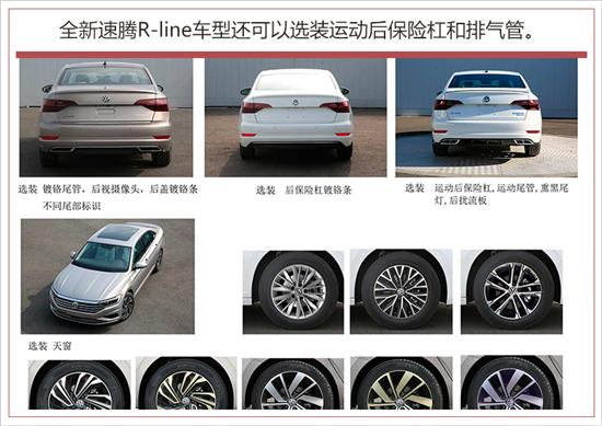 根据申报图可以看到,全新速腾新增了一款R-Line车型,新车在外观方面做了运动化处理,使得整个车头非常具有层次感。另外,尾部熏黑尾灯和双边双出镀铬排气管等套件的加入,使得整体视觉效果非常运动。