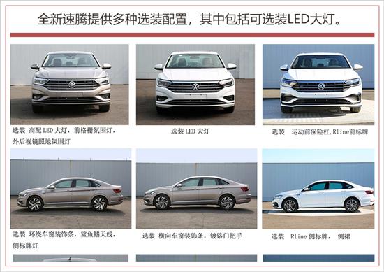 全新速腾提供多种选装配置,包括可选装高配LED大灯、前格栅氛围灯、镀铬尾管、后视摄像头、后盖镀铬条、不同尾部标识、环绕车窗装饰条、鲨鱼鳍天线、横向车窗装饰条、镀铬门把手、天窗、不同轮辋等。