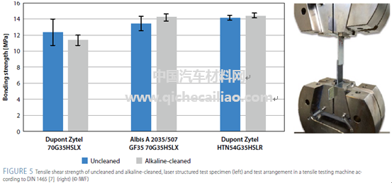 对于大规模生产而言,工艺的可靠性是需要重点考虑的,以确保产品质量的稳定,降低废品率。这里必须考虑粘合剂的润湿性、半成品的预处理和清洁等问题。研究表明,新型互锁结构具有较高且稳定的结合强度,无需昂贵的预处理。图5为几种材料结合强度的测试结果。根据DIN 1465,在100 kN条件下使用以下材料(式样:12.5 mm×25 mm):