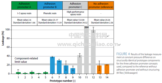 除了机械互锁之外,粘合剂也是非常重要的。这里测试了未经粘合剂粘接以及三种树脂材料粘合剂体系,包括单组份环氧树脂(粘合剂A)、酚醛树脂(粘合剂B)和超高温高性能环氧树脂(粘合剂C)。在有缺口的齿轮箱盖上测试粘合剂,材料分别选改性聚酰胺(PA)6.6和Albis Plastics的35%玻纤增强材料。测试结果显示,只有环氧树脂(粘合剂A)表现出较好的防泄漏性能,具体结果如图4。