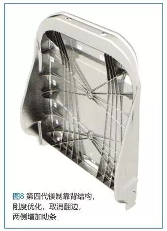 在第4代镁制靠背结构的开发阶段中通过特殊肋条设计对刚度进行了优化。部件的基本结构采用了与第3代相同的侧壁和横撑。侧壁和横撑上边缘位置的壁厚从2mm增大到3mm。另一个主要的改变就是整个部件的前侧和后侧增加了肋条结构(图8)。采取措施之后,与原钢板结构相比,刚度提高了270%,可承受载荷增加到了3462N。该结构为目前具有最大刚度的结构,重量增加到了2.23公斤。虽然重量有所增加,但是仍然大大低于钢板结构的量产靠背。在上一代压铸件的基础上基于轻质化目的开发了第5代镁制靠背结构。在该结构中取消了对于妥协刚度和重量优化来说并不重要的肋条结构(图9)。尽管存在铸造工艺技术难题,也将壁厚进一步降低到了1mm,并进一步增加了镂空面积。通过上述改动减少了70%的重量,重量下降到0.96公斤。所承受的载荷仍然远远高于载荷极限目标值1299N。