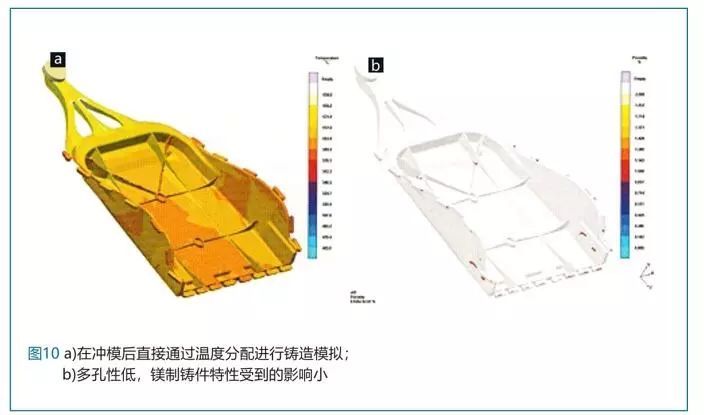 为了验证经过重量优化的第5代镁制靠背结构能够通过铸造技术生产制造,通过分析软件进行了铸造模拟分析。首先要开发适用于该结构的铸造流程系统。需要特别注意的是,要避免不适合的断裂几何结构造成熔液涡流。图10a展示了一种密封式的充填过程。通过特别设置的溢流口进行排气,减少气孔(图10b)。