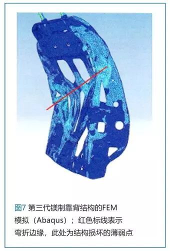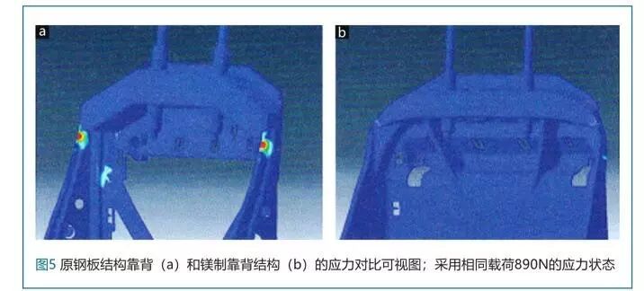 对第2代靠背结构首先进行了结构优化,并对结构进行了刚度优化。也就是说,在整个后壁的上部横撑中增加了翻边,强化了侧壁和横撑之间的边缘,同时在横撑的背面设置了肋条(图4)。此种相对简单但是非常有效的措施将可承受载荷大大提高到了1406N。通过此种改变,与第1代相比部件重量仅增加到了1.52公斤。板式靠背与第2代镁制铸造靠背的FEM模拟对比可以发现,此种量产靠背能够承受比890N更高的载荷,而且只需要进行适当的改动(图5)。