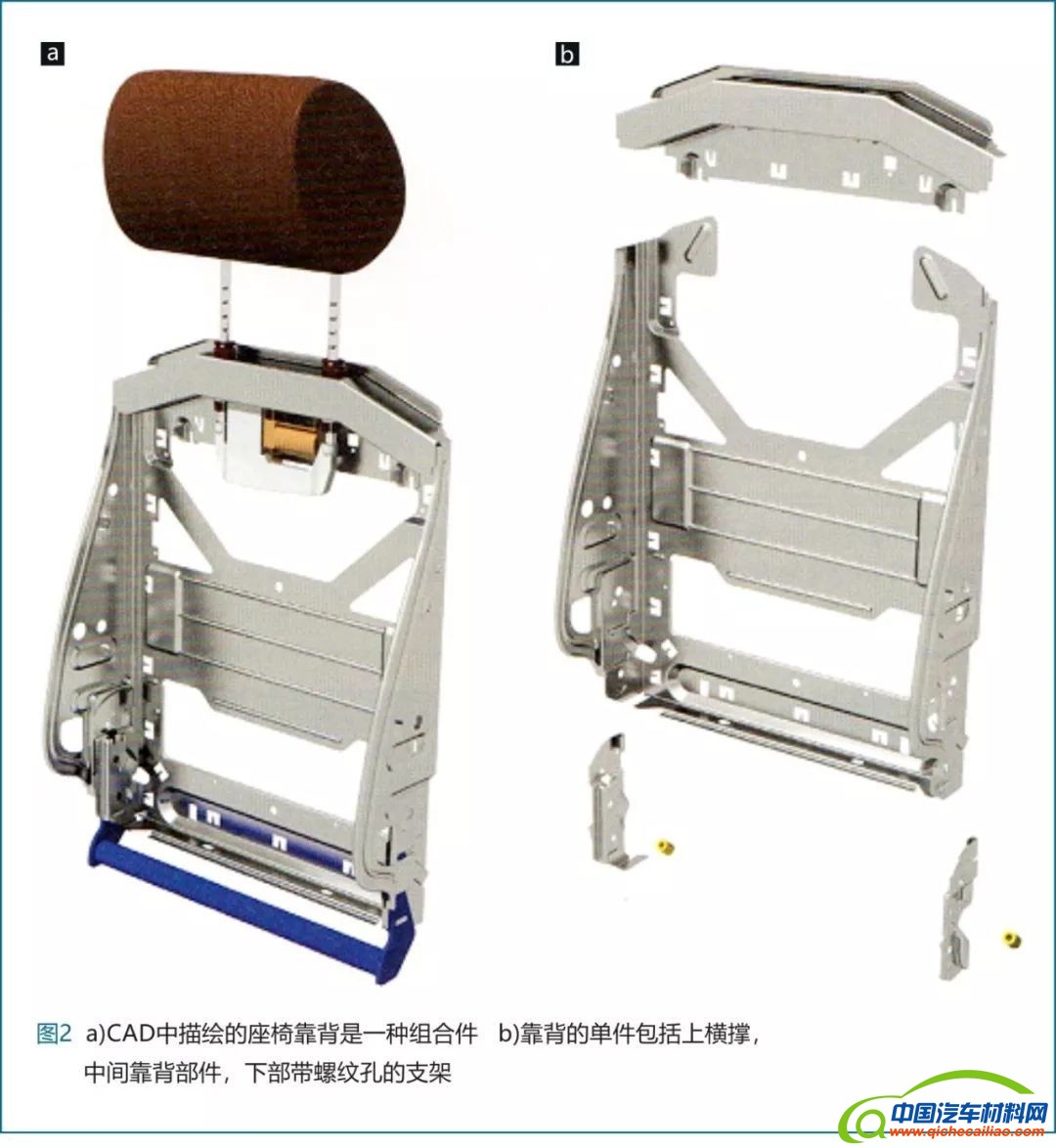 在下图靠背(图2a)的设计中介绍了开发重点。这是一种应用在量产高级汽车中的座椅结构。此种座椅已经作为V8机动化的皮革材质包裹的标准配置,而且还具备头枕电动调节功能。