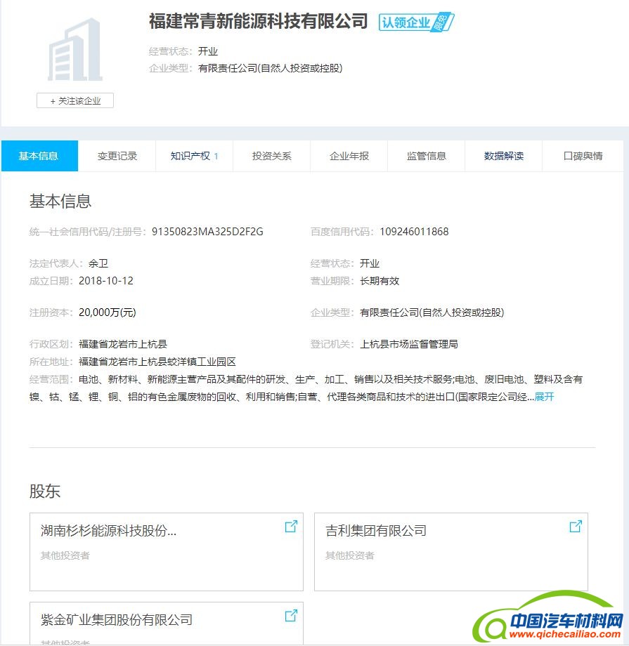 2018年10月,吉利集团与杉杉股份、紫金矿业出资组建了福建常青新能源科技有限公司(下称福建常青)。福建常青官方网站称,该公司是电池回收、前驱体制造为一体的合资企业。福建常青坐落于福建省龙岩市上杭县,注册资金2亿元。根据上杭县政府网站信息,该项目投资额达56亿元。