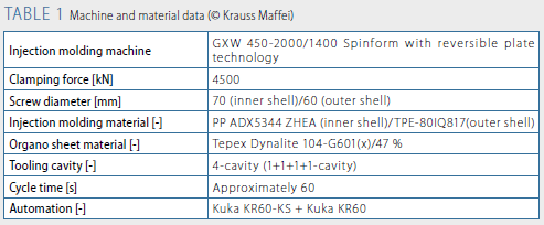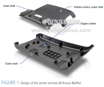 Krauss Maffei还将Fiberform技术与用于多组分注塑成型的Spinform技术相结合。用该工艺制造的中央扶手,内壳由PP和热塑性弹性体(TPE)制成;外壳采用了来自Lanxess的增强有机片材,浸渍PP树脂,然后与热塑性弹性体TPE包覆成型。具体如图1和表1。