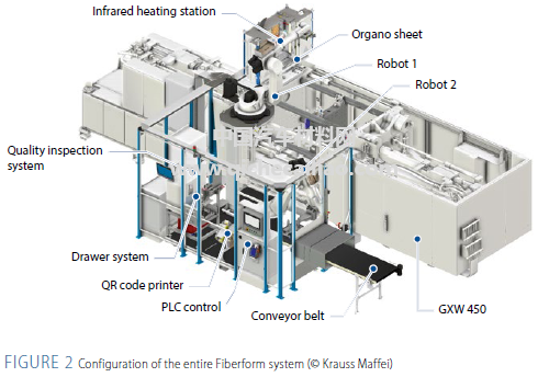 图2和图3是用于制造该中央扶手的自动化生产线。有机片材被输送系统送入,经光学检验确评估有机板的轮廓、纤维取向和尺寸等,将超出规定尺寸公差的部分去除。同时,有机板通过X和Y方向进行精确定位,使得机器人可在相同位置夹取片材,并输送至红外加热站。加热站对片材两侧进行加热后转移至模具系统。通过尽可能缩短这期间的转移距离,可使得片材在转移过程中的热量损失较少,可进一步缩短加热时间。