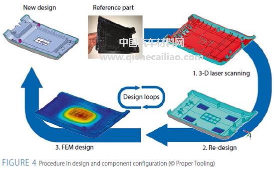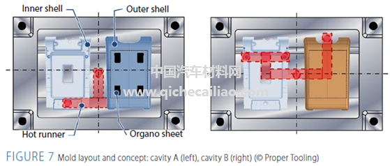 同时,在注塑过程中插入连续纤维增强有机片材的设计有效实现了部件减薄和减重。这一设计的实现也有赖于材料制造商和模具供应商的有力支持。目前如图8的Fiberform技术生产组件在德国慕尼黑的Krauss Maffei技术中心展示。