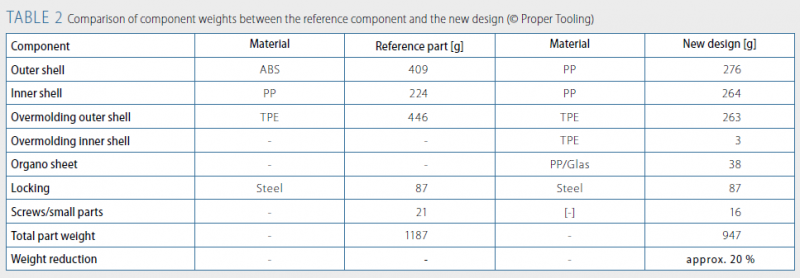 有机片材的插入有效地提升了部件的强度和抗冲击性。因此,在强度满足的情况下,可进一步降低部件壁厚,实现减重。新材料方案的中央扶手可实现减重超过20%,具体见表2。