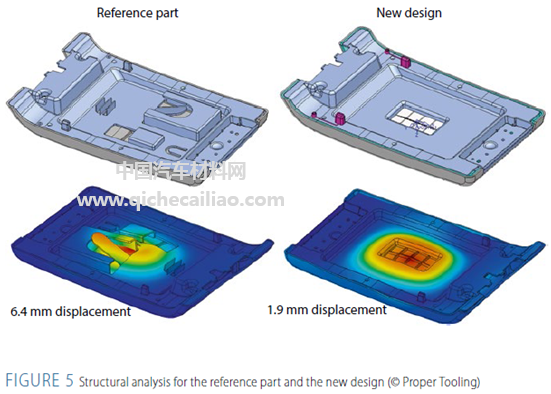 采用逆向工程设计方法对中央扶手进行产品设计,具体如图4所示。为进一步降低重量和成本,原扶手采用的ABS材料被包含有机板增强的连续纤维增强PP复合材料所取代。同时对其厚度、结构等进行优化测试,具体如图5所示。