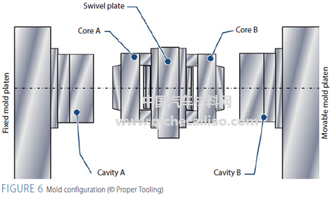 在中央扶手的制造时,第一阶段将扶手的内外壳采用PP注射成型;然后打开模具,延中心点旋转180°。在第二阶段闭模包覆TPE弹性体成型,然后利用机器人脱模。