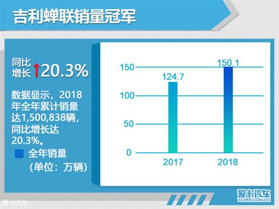 1月7日,吉利汽车公布了2018年12月及全年销量数据:12月销量达93,333辆, 2018年全年累计销量达1,500,838辆,同比增长约20.3%,市场占有率大幅提升。这不仅意味着吉利继续蝉联中国品牌销量冠军,也意味着吉利跨越了150万级的销量门槛。