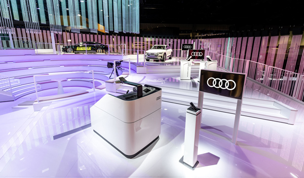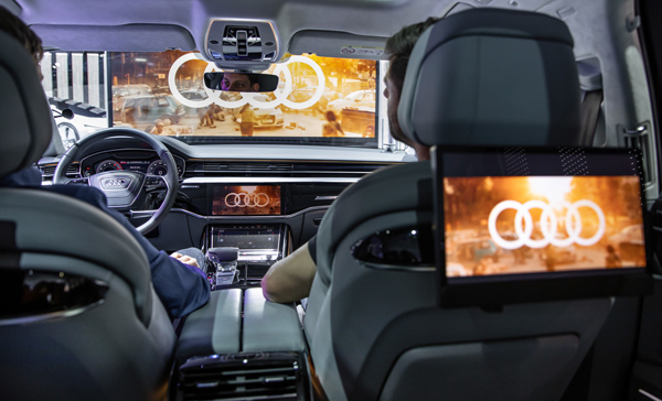 在“奥迪体验之旅”(Audi Experience Ride)这个展示项目中,奥迪把车内空间打造成一个“娱乐天地”。它让坐在奥迪e-tron(测试用)的后排乘客戴上虚拟现实(VR)眼镜,在车辆开动之后看一些设计好的电影影片、电子游戏和其他车载互动内容。
