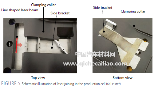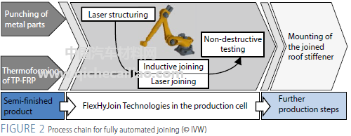 激光焊接是目前较具发展前景的可规模化生产的复合材料/金属连接工艺。由欧盟资助的FlexHyJoin项目开展了汽车顶棚加强筋部件的全自动化激光焊接生产线的研发。