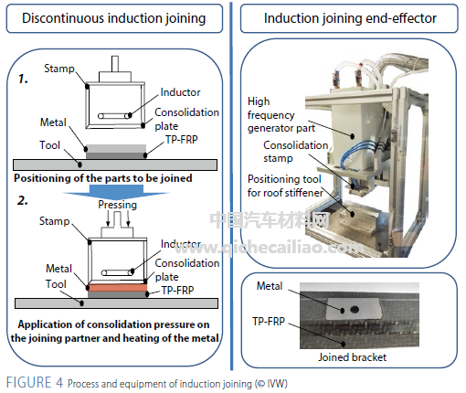 感应加热技术在复合材料连接中应用广泛,但用于复合材料连接时多是加热复合材料,而用于混合材料连接时,一般需要加热金属元件。研究人员在该项目中使用了连续感应加热技术,如图4。当高频交流电流过电感器时,在其周围形成电磁交变场,通过电阻和磁滞损耗在金属中产生热能。金属被感应加热直至其高于熔化温度并低于所用基质聚合物的降解温度。在该区域中,复合材料在与金属的接触点处熔融,并在压力作用下填充至金属表面形成的空腔中。