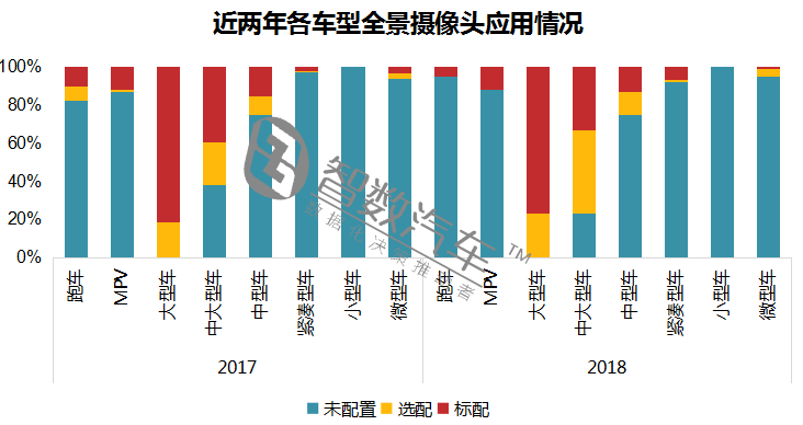 全景摄像头的配备将有助于减小视野盲区、减轻停车压力,从而降低剐蹭、碰撞等事故的发生。这对于中、大体积车型来说,无疑是一个好帮手。从近两年各级别车型全景摄像头的配置情况来看,大型车综合配置率基本达到100%;中大型车的综合配置率也较高,达到60%以上。