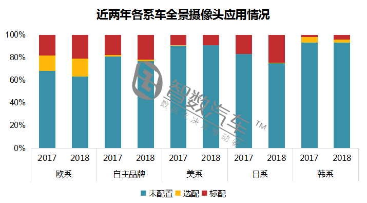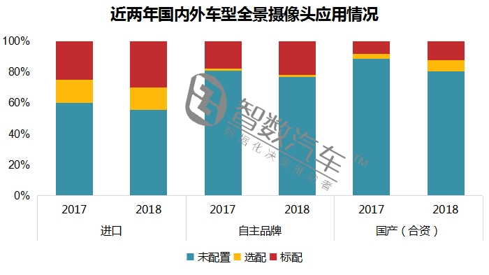 在车型的应用中,进口车的全景摄像头配置率一般较高,且欧系车更加青睐全景摄像头,近两年的综合配置率均超过30%。自主品牌17和18年全景摄像头的综合配置率分别为19.09%和23.01%。