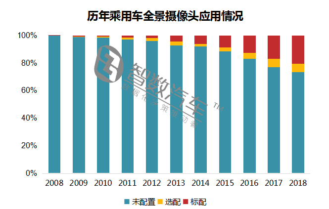 基于此,智数汽车TM对过去11年乘用车市场的全景摄像头配置情况进行调研和分析,发布了《乘用车市场全景摄像头配置趋势研究(2019版)》报告。报告显示,随着汽车自动化发展,全景摄像头在汽车上的应用逐年增加,2018年有约25%的乘用车配置全景摄像头,全景摄像头或成“后来佳器”。
