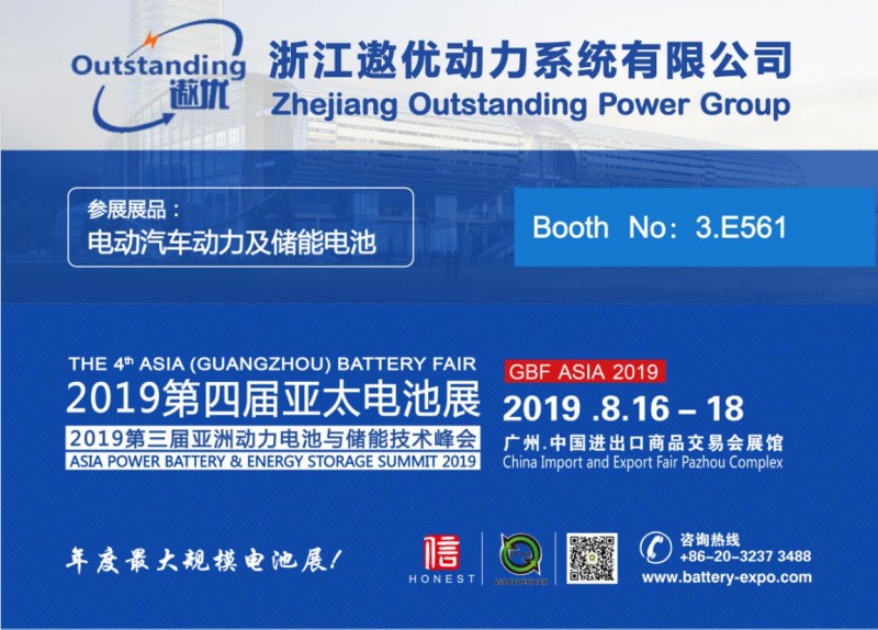摘要:浙江遨优动力系统有限公司以144平米超大展位重磅出席2019年8月16-18日在广州.广交会展馆A区举办的GBF.ASIA 2019第四届亚太电池展!