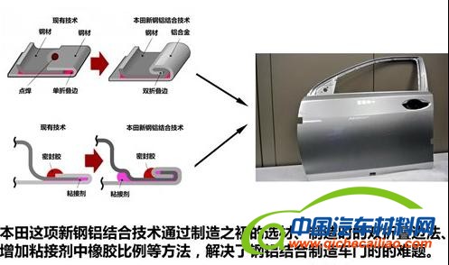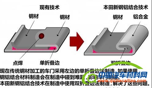 在应对钢铝结合加工过程产生曲翘这个问题时,本田的解决办法是使用双折叠边法。现在制造车门采用的是单折叠边法,如果使用钢铝结合材质制造车门还采用单折边法的话会产生一系列的问题,比如在重叠铝板与钢板用机器人涂抹粘接剂后,粘接剂夹在板与板之间。由于无法抵抗外板伸长的力,粘接剂的膜会随着剪切应力变形。涂装工序前的清洁和涂装完成后的烘干过程中,铝材也会因为温度上升产生曲翘。从涂装室出来冷却后,粘接剂就会硬化,也会使整个车门发生曲翘。