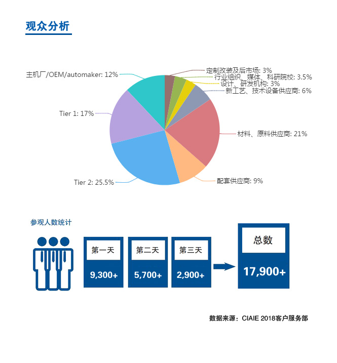 由英佛会议展览(上海)有限公司主办、中国汽车工业协会汽车相关工业分会、中国汽车工业协会车身附件委员会、上海国际汽车城(集团)有限公司、上海市嘉定区安亭镇人民政府等相关单位全程参与协助支持的“2018第八届中国上海国际汽车内饰与外饰展览会”(CIAIE 2018)于8月15-17日在上海汽车会展中心成功召开。展会共迎来中国、美国、加拿大、德国、俄罗斯、法国、英国、日本、韩国、西班牙、意大利、澳大利亚、墨西哥、印度、巴基斯坦、捷克、中国台湾、中国香港等20多个国家和地区的近18000名专业观众。