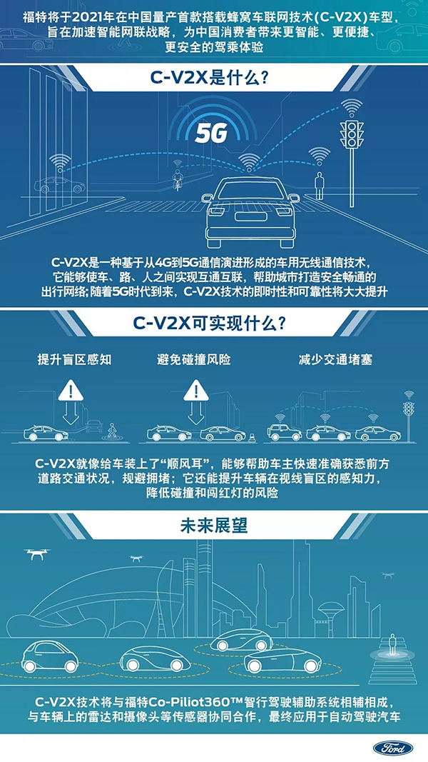 作为全球5G技术的领先开发者,中国境内的三大网络运营商均已发布了5G商用时间表,正快速推进5G网络基础设施建设。而蜂窝网通信技术从4G迈向5G,则是C-V2X技术转变为车用无线通信技术的重要环节。身为5G汽车联盟成员(5GAA),福特汽车与行业内各公司和各地政府组织紧密合作,全力支持C-V2X技术在全球范围内的开发和应用。
