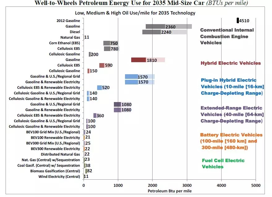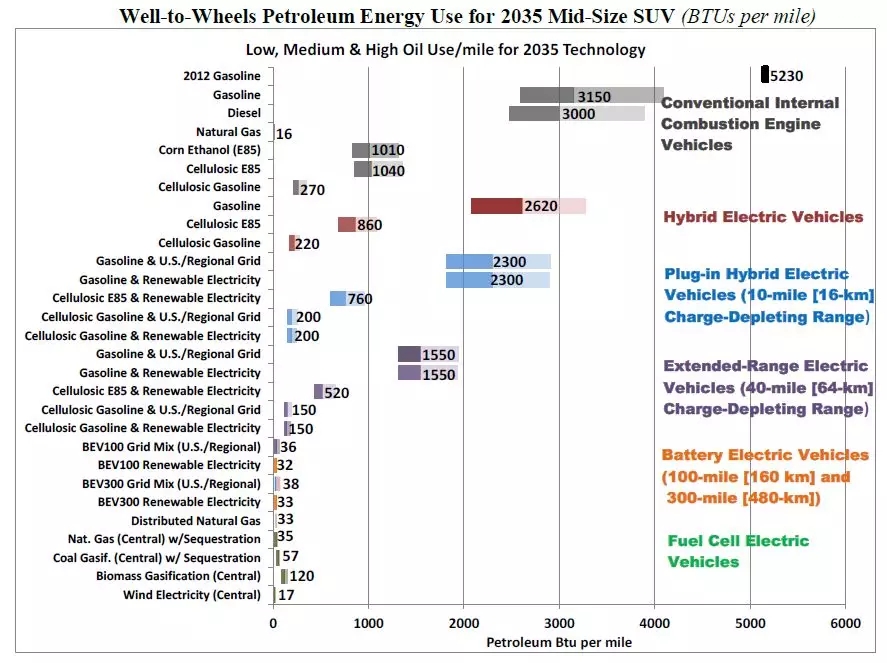 对此,我们必须明确,能源是从哪里开始计算的?美国能源部提出了2035年全周期能耗(BTUs/miles)的评价。BTU,指的是英热单位,1度电约等于3412BTUs。而所谓全周期,指的是从最初的能源生产到被车轮消耗掉的整个过程。具体如下图所示。