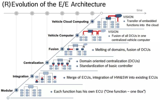 博世的渐进式路线从域的集中化开始演进,终极目标一样是车载中央计算机。