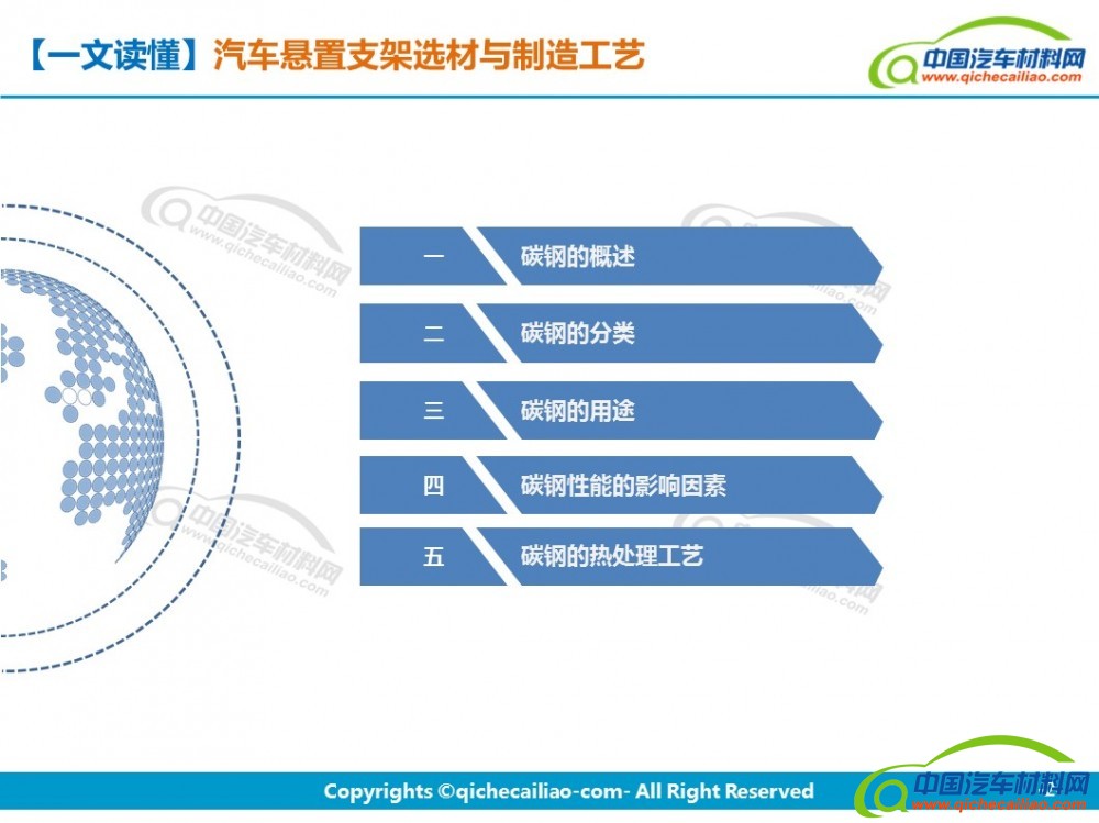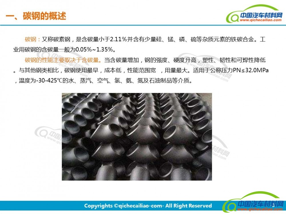 碳钢:又称碳素钢,是含碳量小于2.11%并含有少量硅、锰、磷、硫等杂质元素的铁碳合金。工业用碳钢的含碳量一般为0.05%~1.35%。