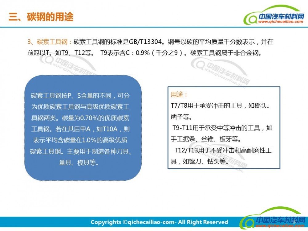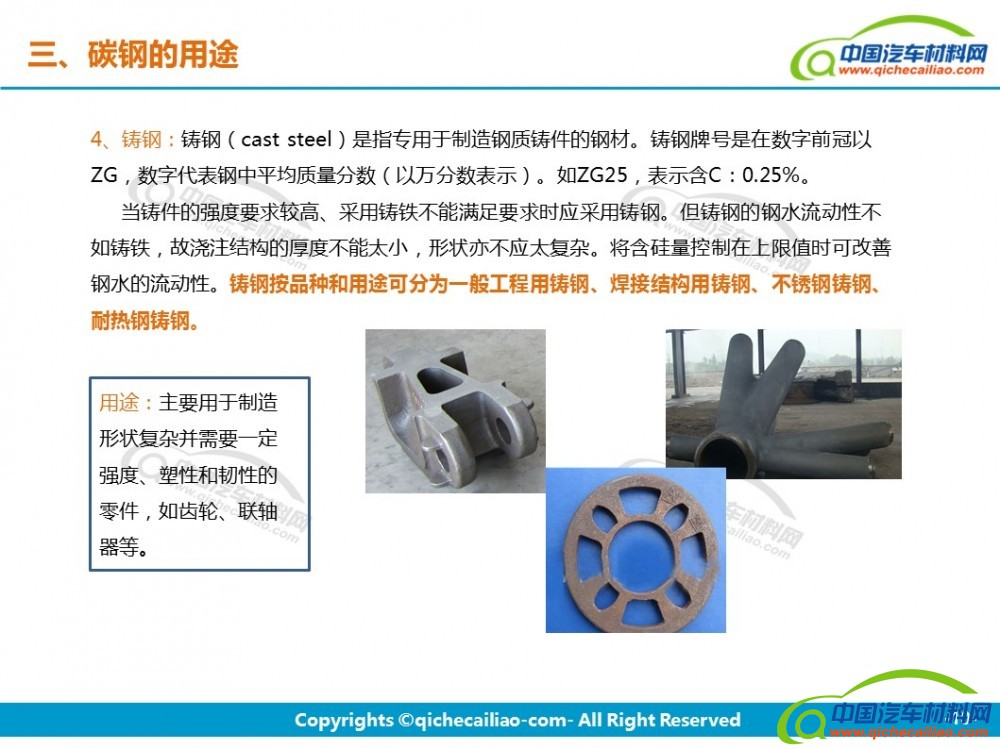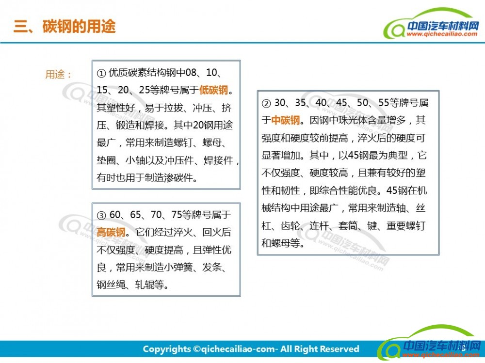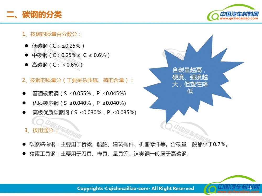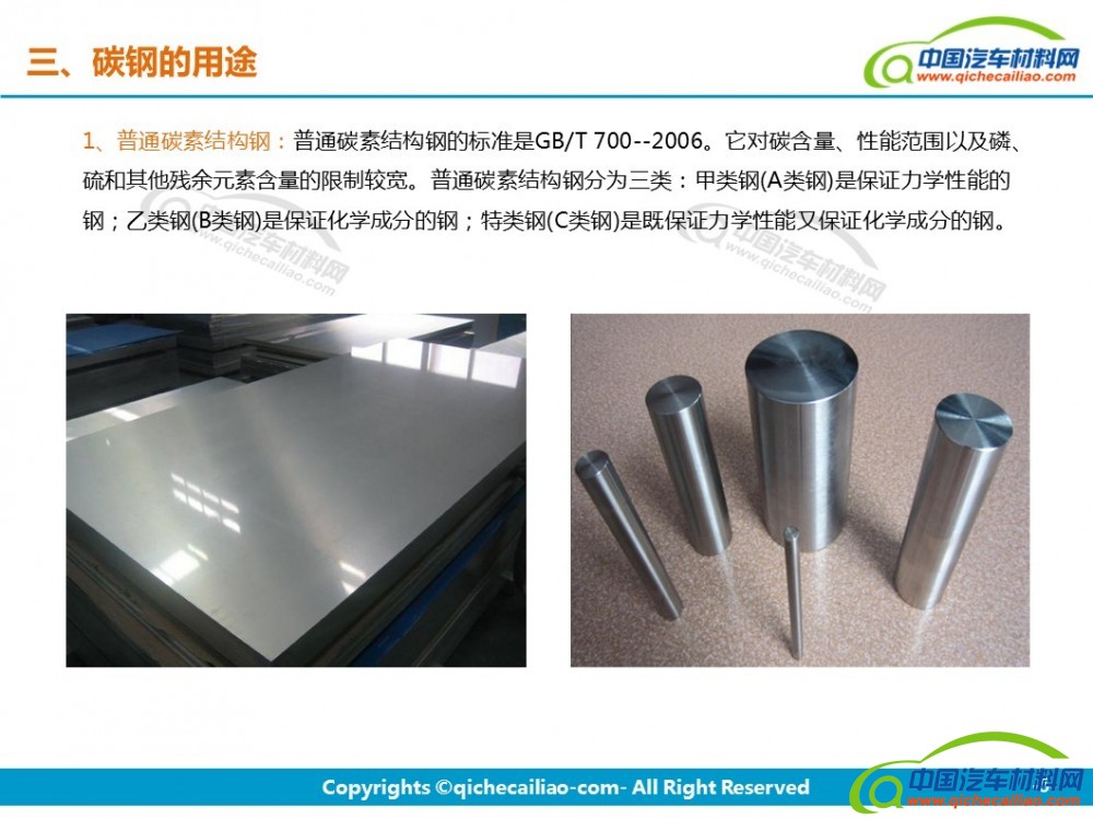 普通碳素结构钢:普通碳素结构钢的标准是GB/T 700--2006。它对碳含量、性能范围以及磷、硫和其他残余元素含量的限制较宽。普通碳素结构钢分为三类:甲类钢(A类钢)是保证力学性能的钢;乙类钢(B类钢)是保证化学成分的钢;特类钢(C类钢)是既保证力学性能又保证化学成分的钢。