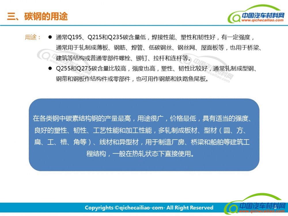 在各类钢中碳素结构钢的产量最高,用途很广,价格最低,具有适当的强度、良好的塑性、韧性、工艺性能和加工性能,多轧制成板材、型材(圆、方、扁、工、槽、角等)、线材和异型材,用于制造厂房、桥梁和船舶等建筑工程结构,一般在热轧状态下直接使用。