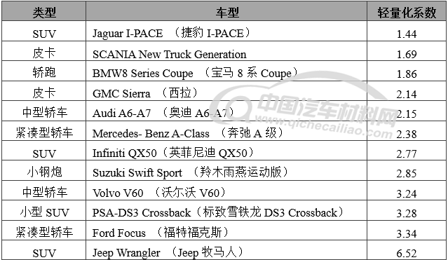 车身轻量化系数是目前被行业普遍接受的一个评价车身轻量化水平的指标,车身轻量化系数越小轻量化水平越高。它是综合了车身尺寸、重量和性能三方表现获得的数据。