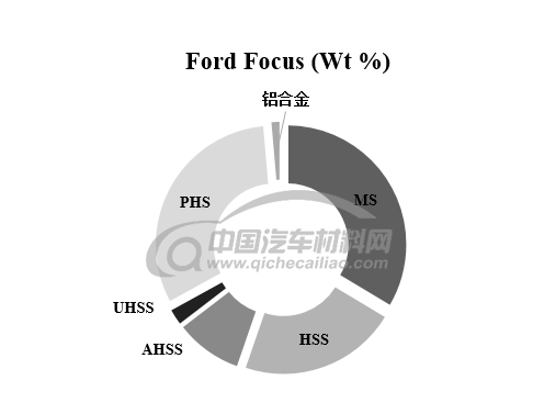 下图为福特新福克斯的白车身(包括四门两盖)用材情况。由图可知,该车身用材以钢为主,部分采用铝合金。其中传统软钢用量33.7%;高强度钢、先进高强度钢和热成形钢等达到65%;铝合金用量1.4%,前保险杠横梁采用7000和6000铝合金,相比之前的钢制保险杠横梁(7kg),重量减轻3.9kg,轻量化效果显著。