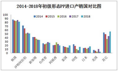 2014-2018年初级形态进口产销国数据对比发现,韩国、沙特阿拉伯、新加坡、台湾是国内进口主要来源国,其中韩国表现较为突出排名一直位居首位,从历史数据分析,排除2017年特例,进口韩国均聚PP资源呈现小幅减少趋势,结合国内扩能形势,可发现,国内初级形态聚丙烯逐步处于饱和状态,且部分拉丝资源供大于求局势明显,故对进口韩国及各国初级形态依赖度逐步下降。