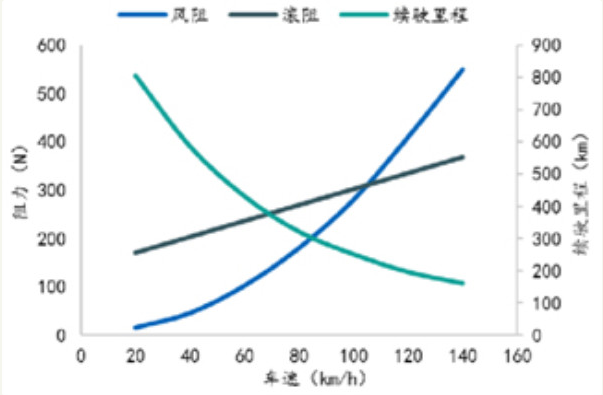♦车辆滚阻、风阻和续驶里程与车速关系