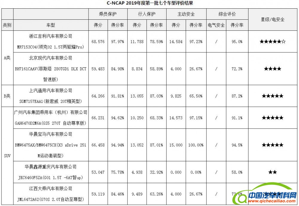 2019年4月16日,中国汽车技术研究中心有限公司在上海车展期间发布了2019年度C-NCAP第一批7款车型的评价结果。本次发布结果的7款车型中,包括2款A类车,1款B类车,4款SUV车型,试验车辆全部由C-NCAP管理中心从各车型4S店购买。购车费用支出共计约372.3万元。该批7款车型涉及4个自主品牌、3个合资品牌,其中2款车型为自愿申请评价。第一项AEB试验于2018年12月24日开始,最后一项试验至4月12日完成。全部车型按照《C-NCAP管理规则(2018年版)》依次进行AEB试验、行人保护试验、三项实车碰撞试验以及鞭打试验,最后分别按照C-NCAP规程进行评分和星级评定。每款车型的每项试验安排均在C-NCAP官网上提前公开。