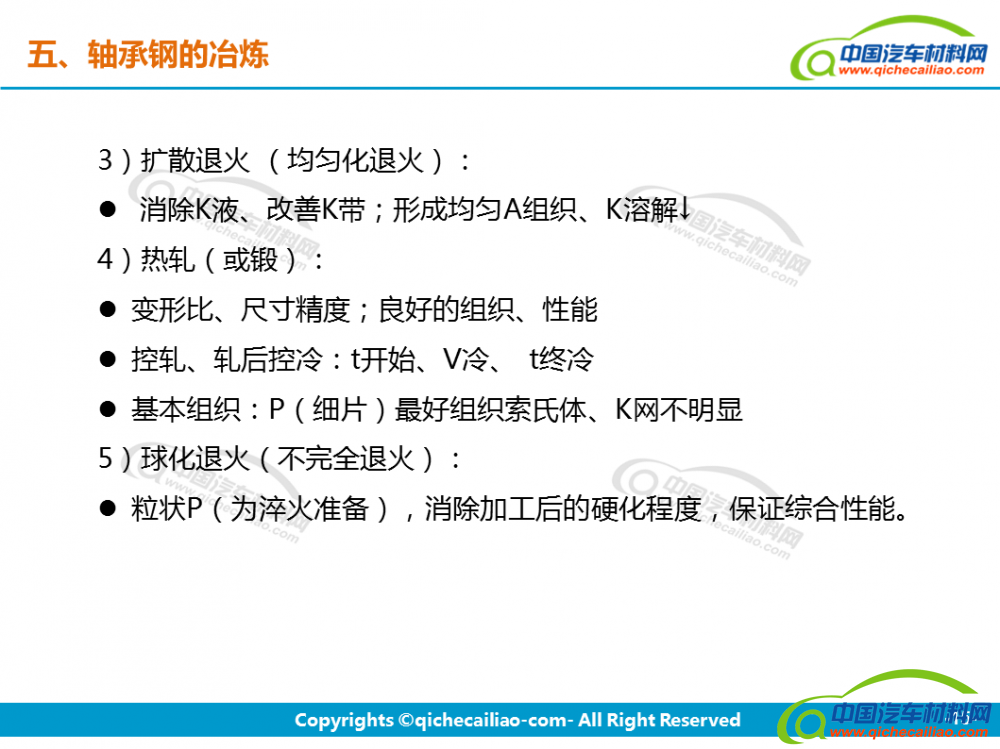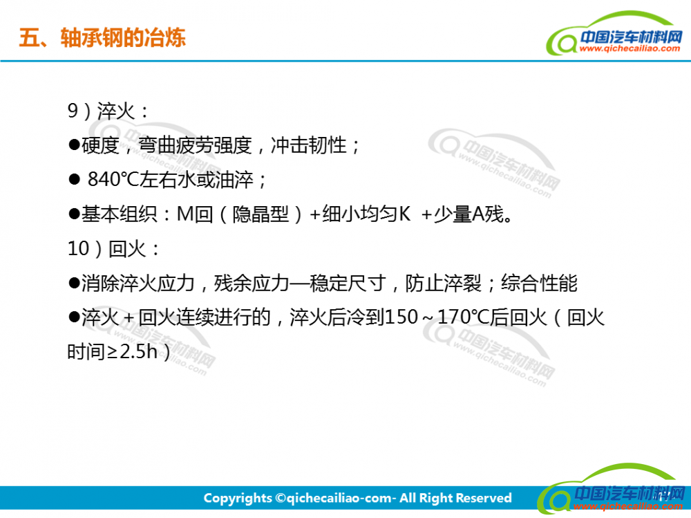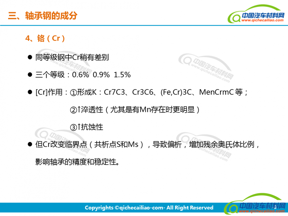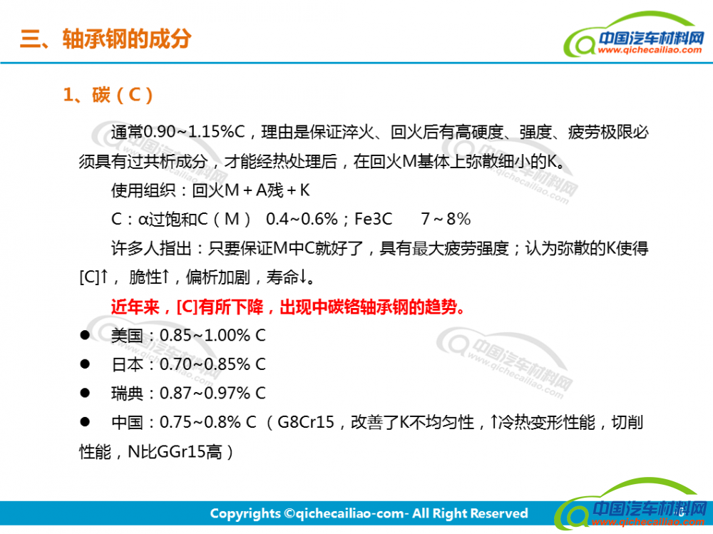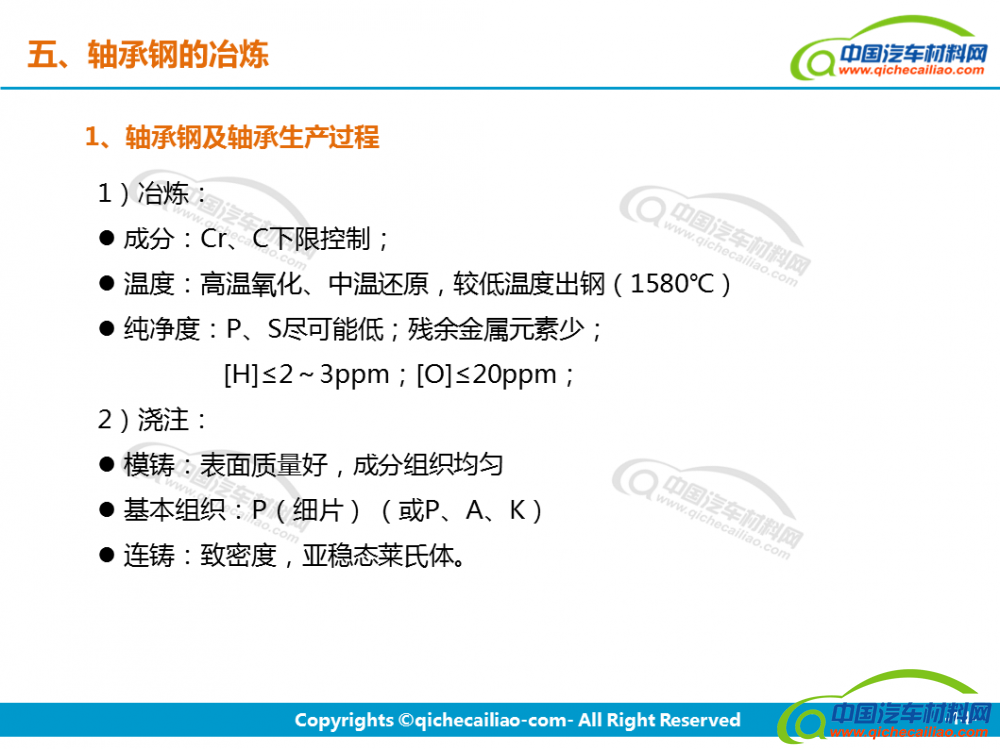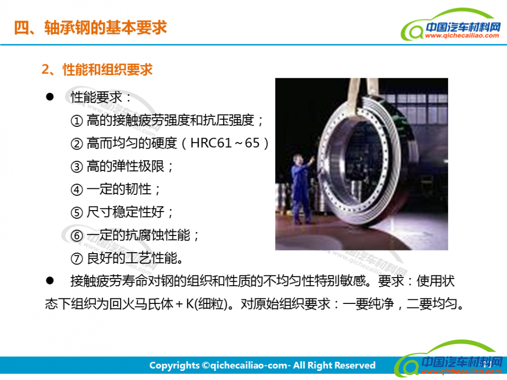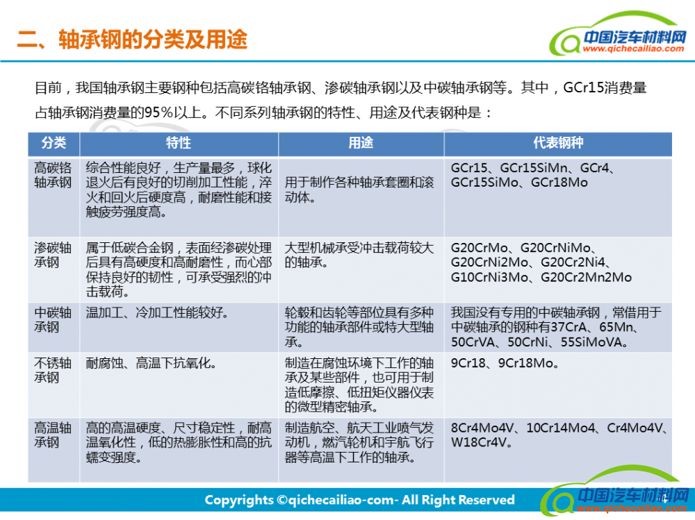 轴承钢:轴承钢是用来制造滚珠、滚柱和轴承套圈的钢。轴承钢有高而均匀的硬度和耐磨性,以及高的弹性极限。对轴承钢的化学成分的均匀性、非金属夹杂物的含量和分布、碳化物的分布等要求都十分严格,是所有钢铁生产中要求最严格的钢种之一。