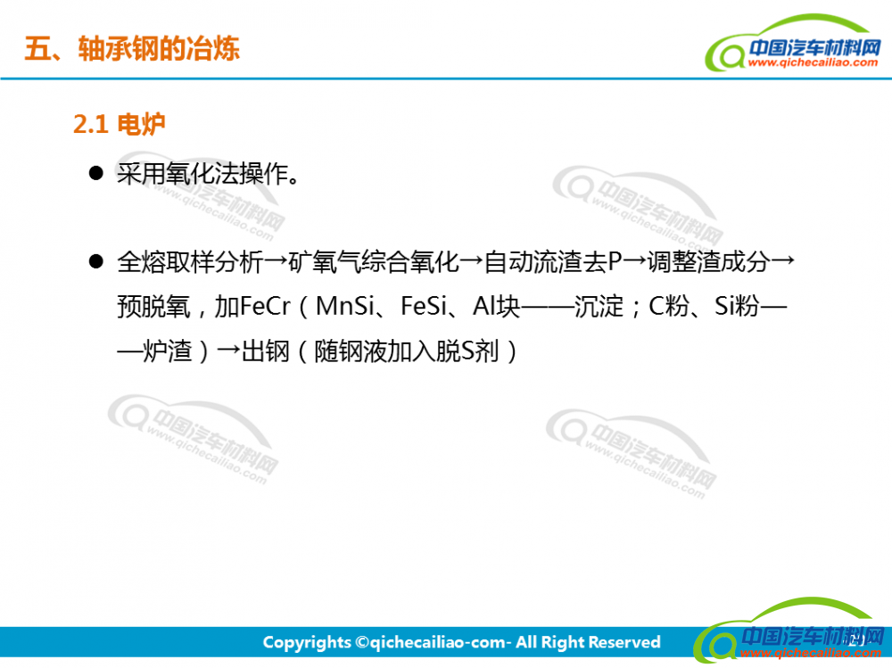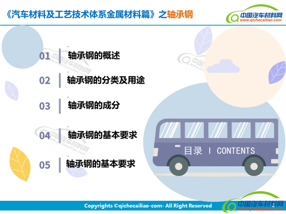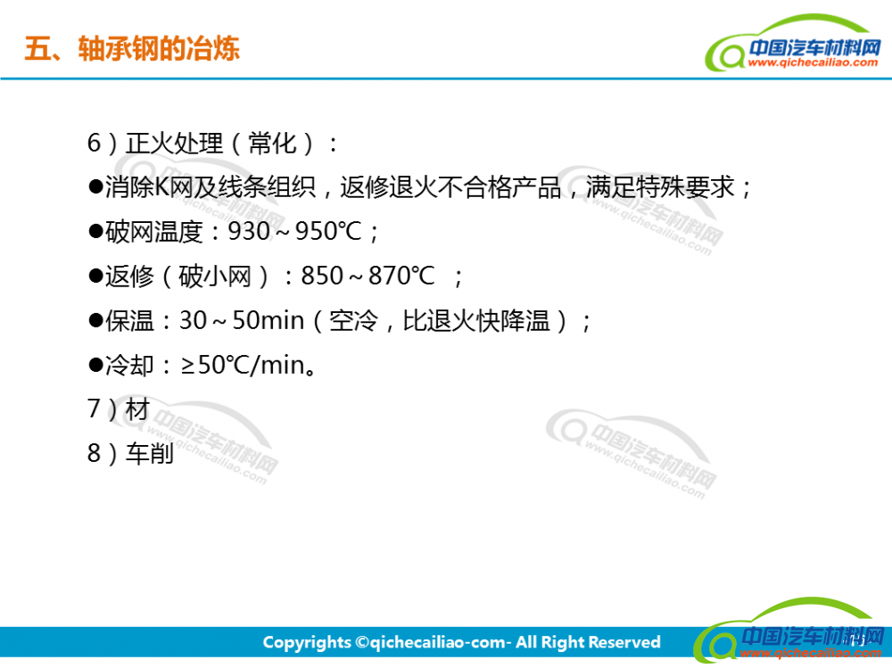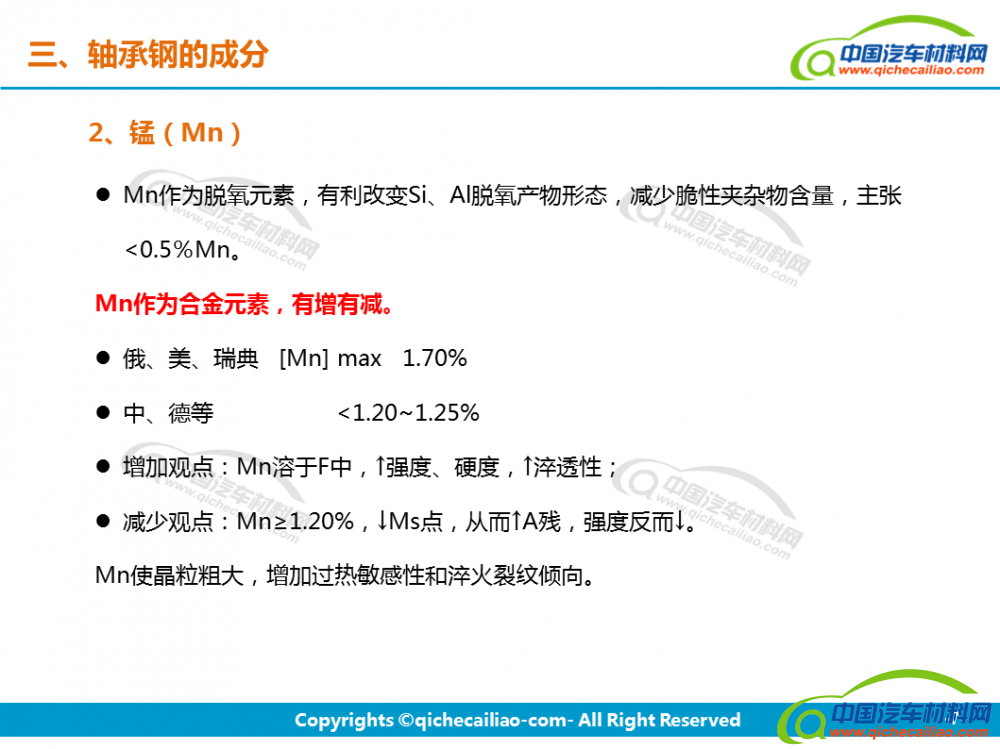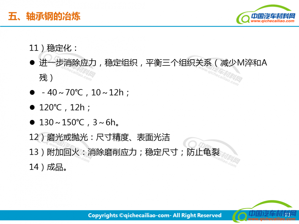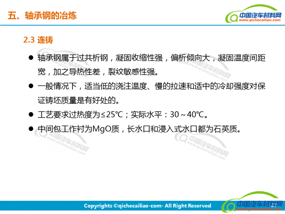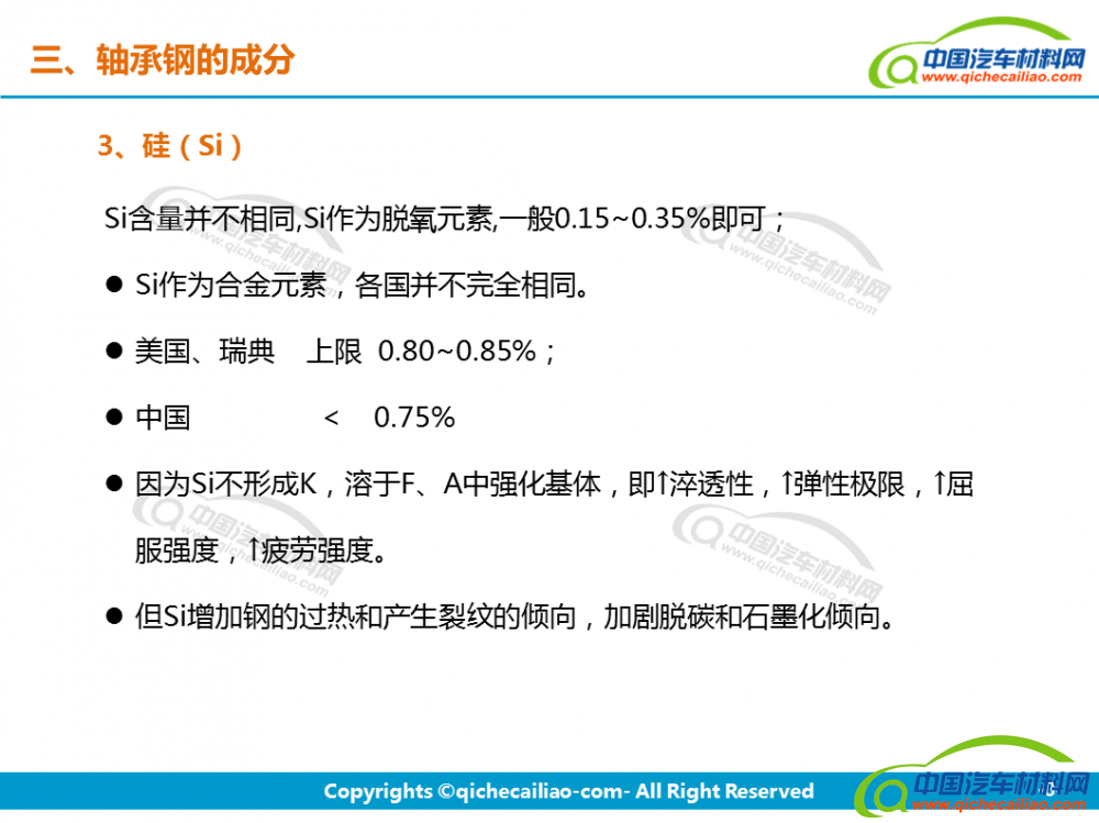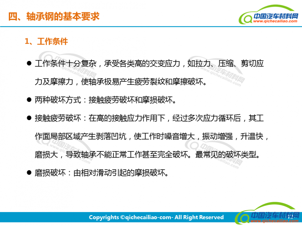 轴承钢:轴承钢是用来制造滚珠、滚柱和轴承套圈的钢。轴承钢有高而均匀的硬度和耐磨性,以及高的弹性极限。对轴承钢的化学成分的均匀性、非金属夹杂物的含量和分布、碳化物的分布等要求都十分严格,是所有钢铁生产中要求最严格的钢种之一。