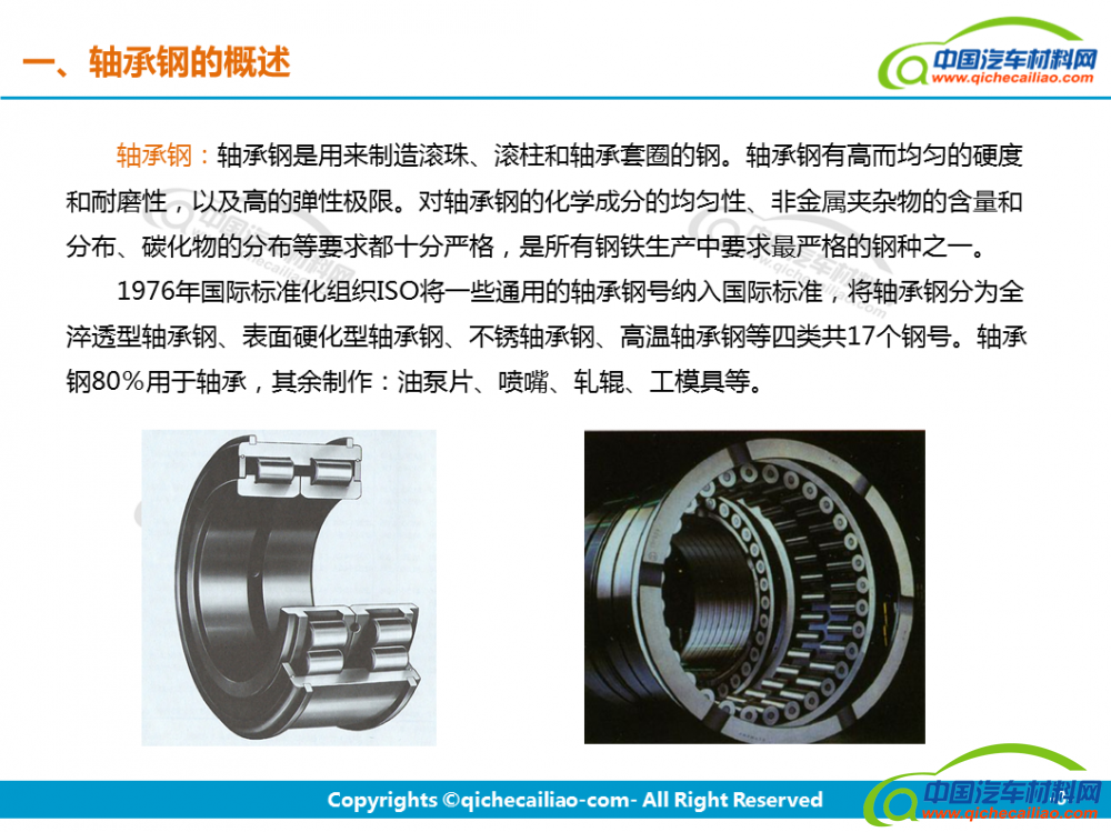 1976年国际标准化组织ISO将一些通用的轴承钢号纳入国际标准,将轴承钢分为全淬透型轴承钢、表面硬化型轴承钢、不锈轴承钢、高温轴承钢等四类共17个钢号。轴承钢80%用于轴承,其余制作:油泵片、喷嘴、轧辊、工模具等。