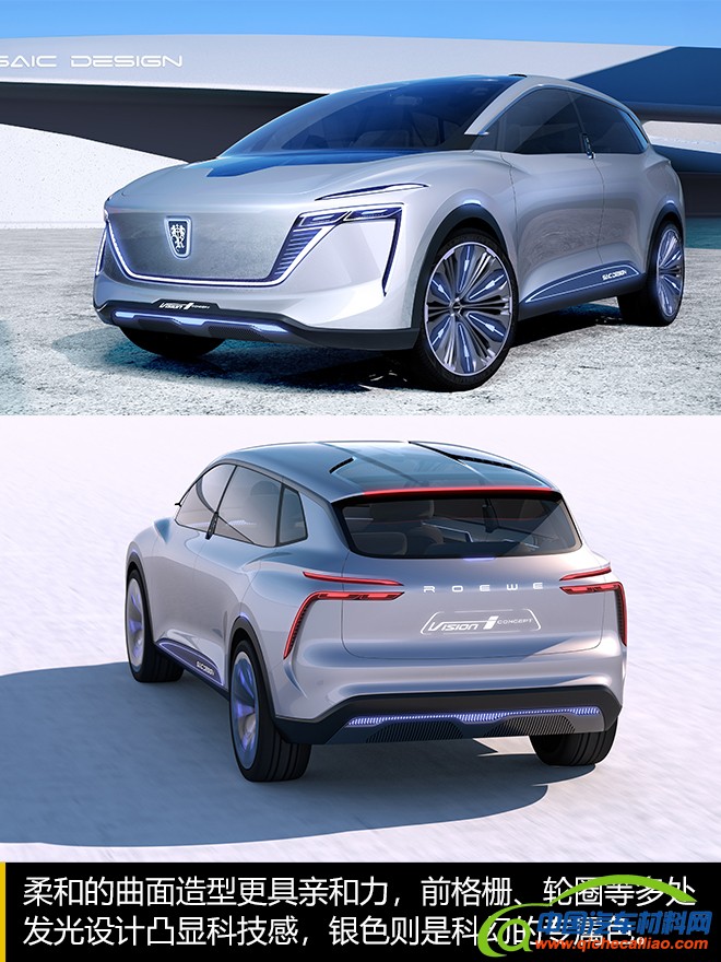 外形设计上,Vision-i概念车的前脸将荣威家族化的“律动”格栅抽象化,以光带勾勒,内部则为点阵式的LED光点,让科技感得到凸显,并能在自动驾驶时点亮,提醒周围。大量的曲面造型让车身饱满且柔和,亲和力很强,同时也能起到降低风阻的作用。据设计师称,概念车上这款被称作“银翼”的银色中加入了一些紫色相,配合车身上的蓝色灯光,让整车更具未来感。