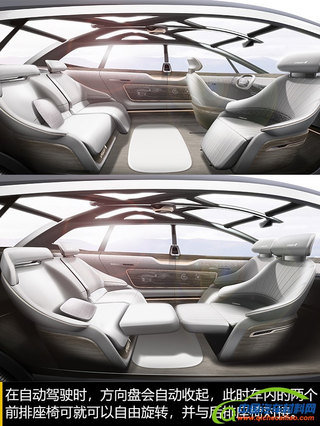 本足够设计三排座椅的超大车内空间减去了中间一排,让前后排的空间都像懒人沙发一样宽裕,也预留出了前排座椅向后旋转的空间。四只独立座椅可以各种形式组合,保证每位车内乘员都有足够舒适的体验。同时,Vision-i概念车木纹+皮质的用料配以浅色调营造出了恬静的家具氛围,让进入车内就像回家一般惬意。