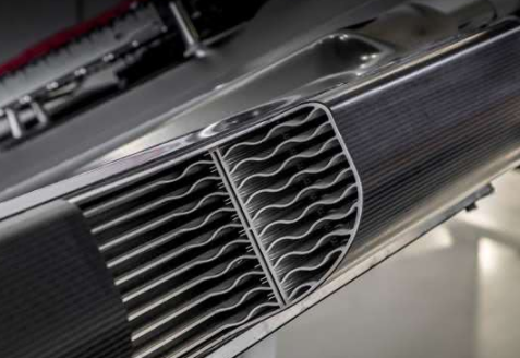 FW-EVX结构的核心是其250mm厚的“skateboard”单体构造,它将电池模块存放在两个中空的承载CFRP侧轨(侧梁)之间,这些侧轨同时从挤压罐输送空气——位于汽车前部的双进气口通过内部铝制散热器来冷却电池。这取消了位于前部的传统散热器,最大程度地减小了汽车的整个前部结构以及换热器的气动阻力。这种铝制散热器还可充当电池周围的受控粉碎带,以增加冲击保护。
