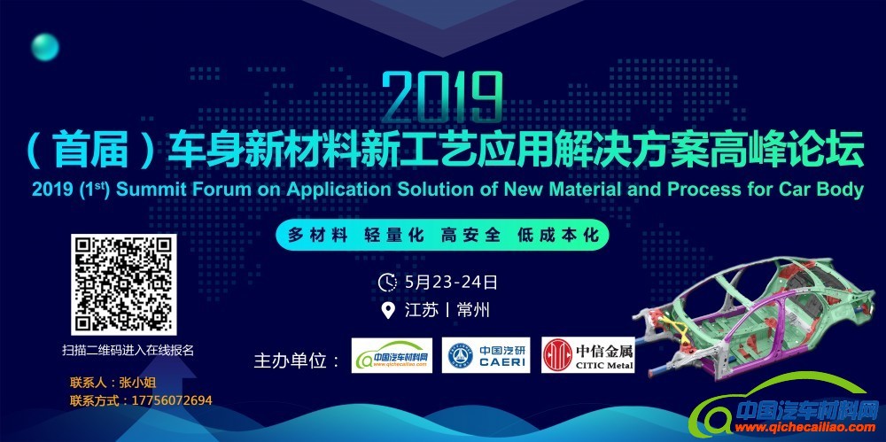 零部件新材料新工艺的应用现状及发展趋势,促进产业链的合作与交流,中国汽车材料网将联合中信微合金化技术中心于2019年5月23日-24日,在江苏•常州召开“2019(首届)车身新材料新工艺应用解决方案高峰论坛”!