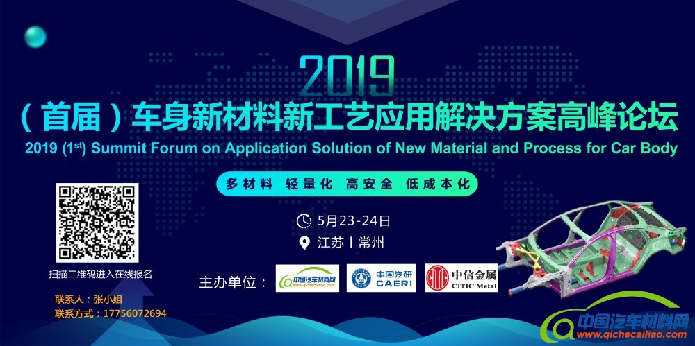 由中国汽车材料网联合中信微合金化技术中心、中国汽车工程研究院有限公司举办的“2019(首届)车身新材料新工艺应用解决方案高峰论坛”。将于2019年5月23日-24日,在江苏•常州召开!