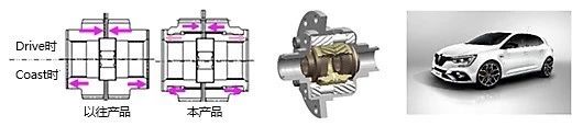 本产品是在以往托森差速器(TORSEN)Type-B的基础上分割侧齿轮,在结合部位采用螺旋形花键,以此提高左右轮的扭矩分配比例,从而提高牵引性能和行驶时驾乘感受的高性能产品。本产品将螺旋形花键设计为单向结构,因此在加速时可以提高差动控制性能与扭矩分配的比例。同时,减速时还也可以抑制差动控制的作用。由此本产品可以根据搭载车辆的特点实现最佳的扭矩分配和驾驶性能的提升。